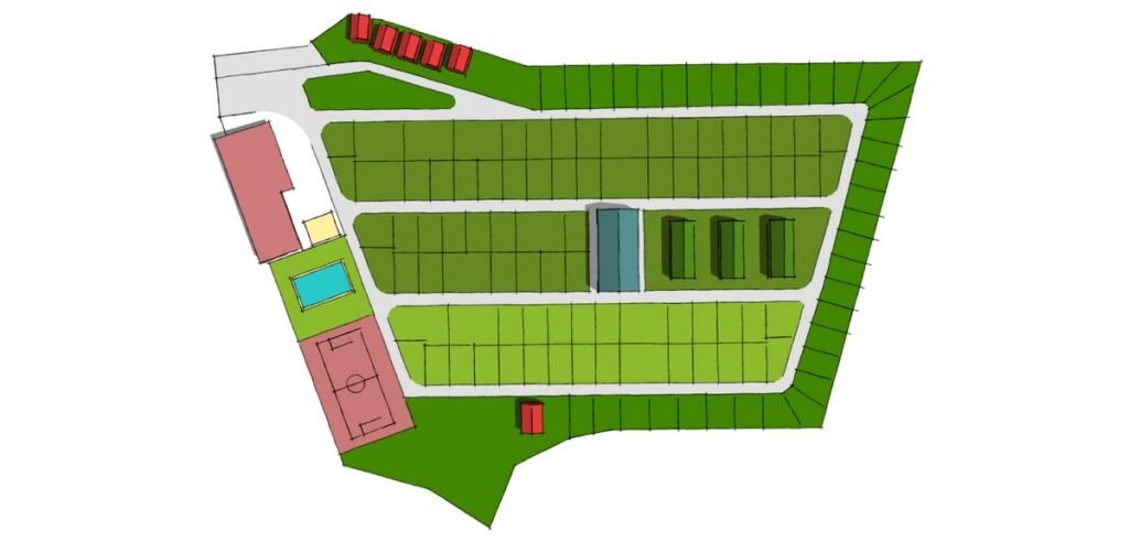 No existe una división física entre las parcelas, lo que le da un ambiente más abierto y natural a la vez que facilita el acceso a los vehículos más grandes.