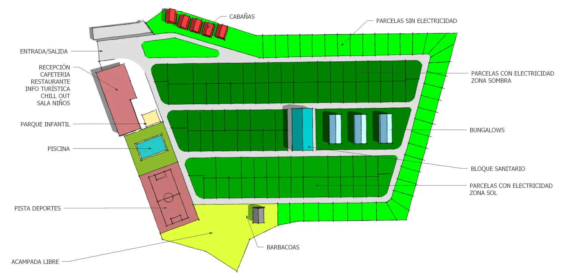 El camping tiene 146 parcelas de 60m2 cada una, la gran mayoría con forma rectangular de 10 x 6m. Al no existir una división física entre las parcelas, el acceso es muy cómodo y caben tiendas y vehículos de todos los tamaños.