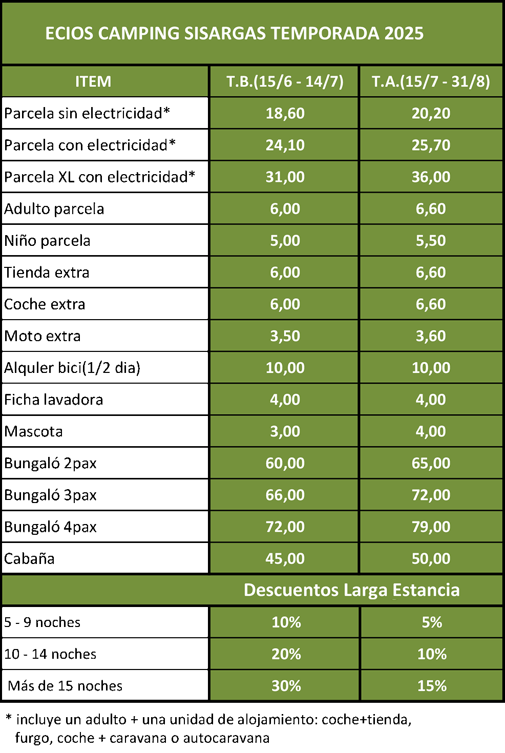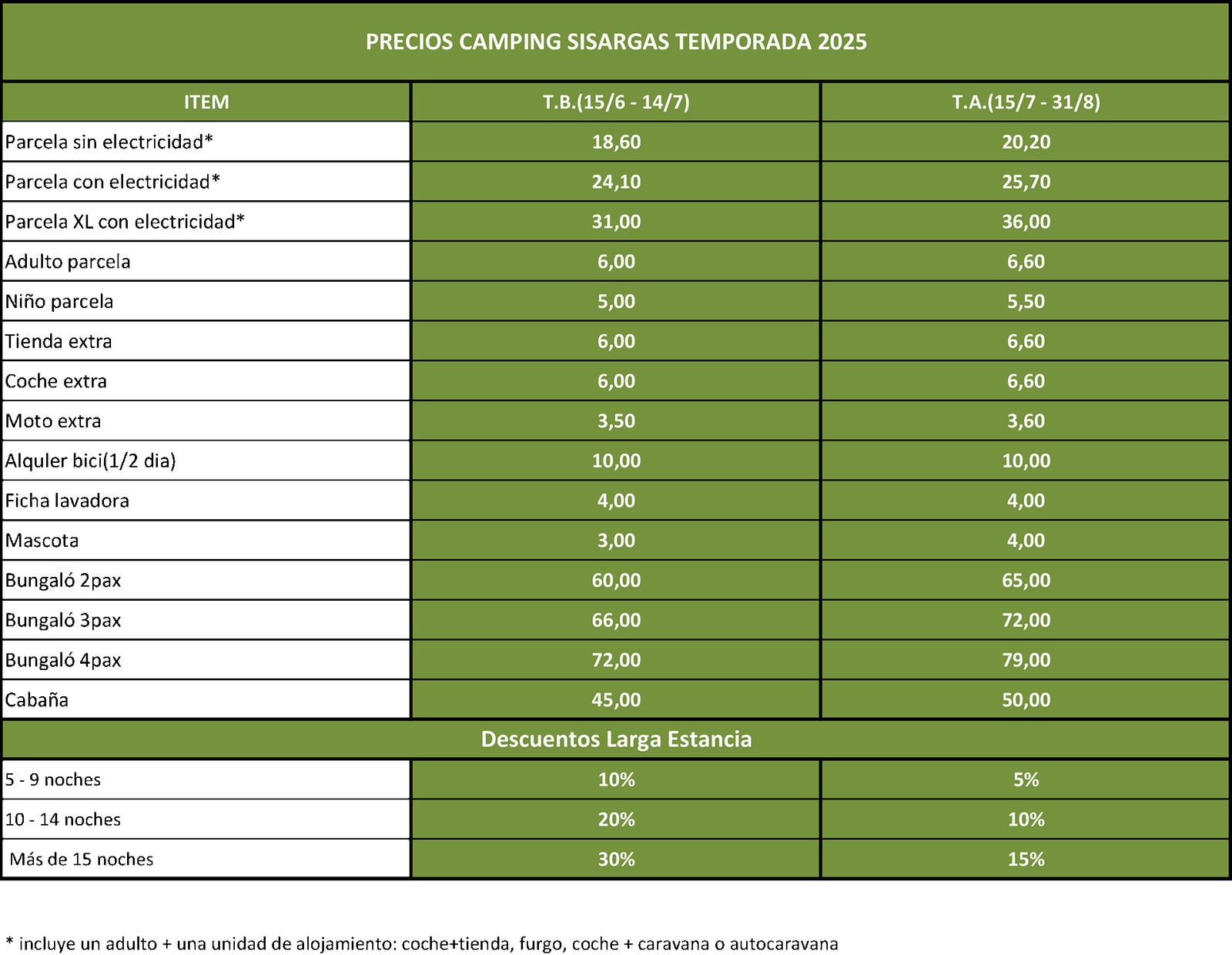 Consulta aquí todos los precios actualizados de nuestras parcelas y bungalows, así como los servicios opcionales disponibles. Ofrecemos tarifas claras y ajustadas a cada temporada para que planifiques tu estancia con total confianza.